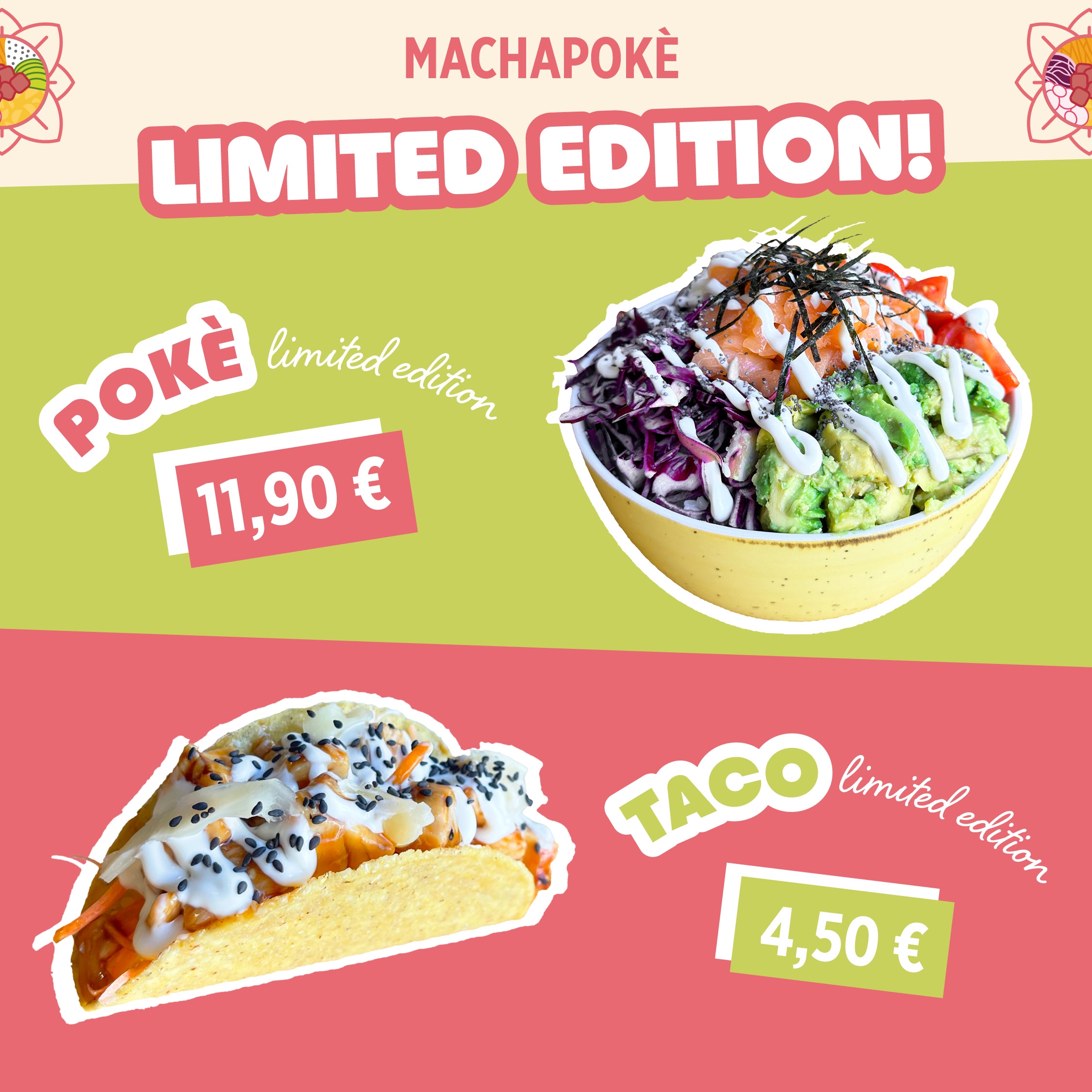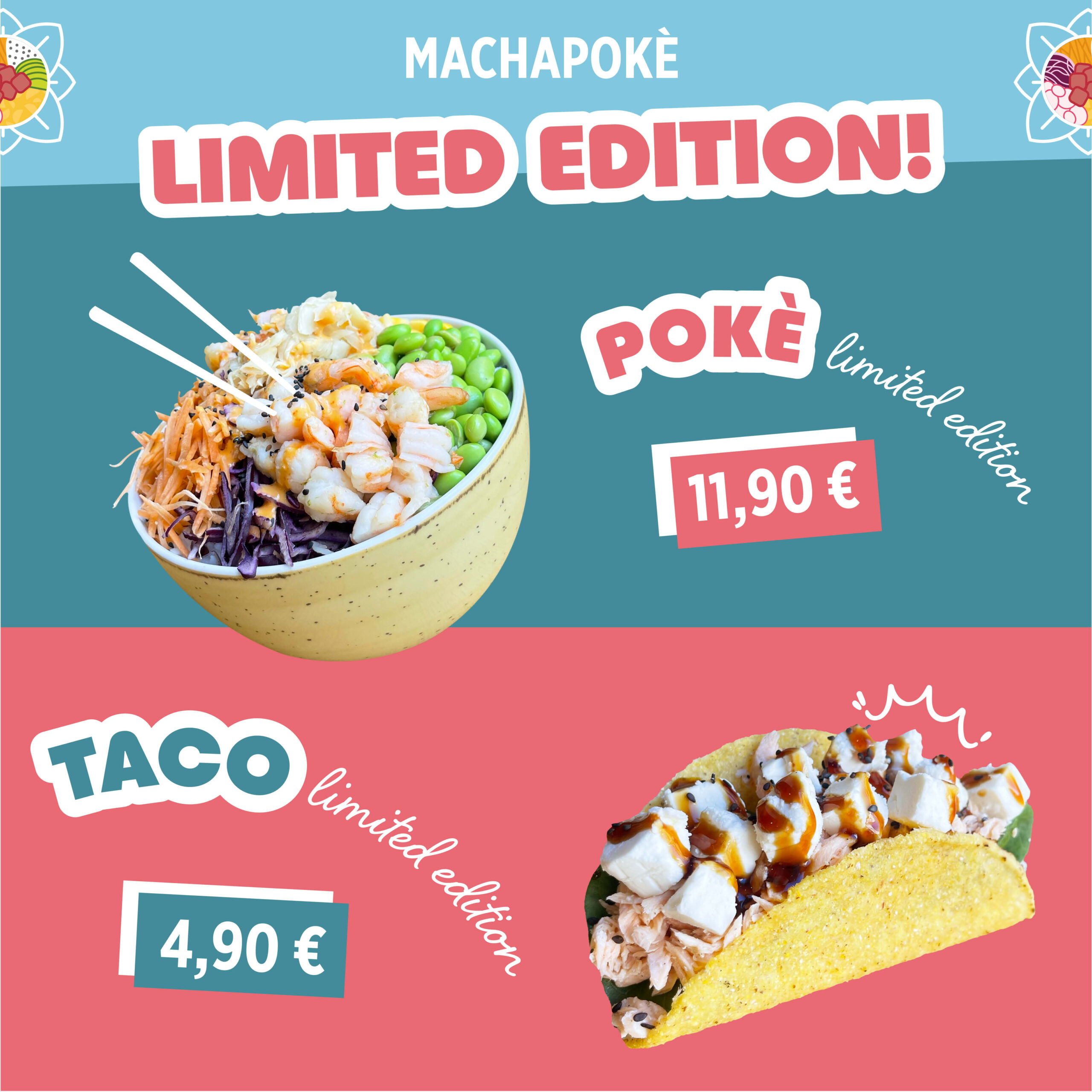 Non perderti le SUPER LIMITED EDITION! Vieni a provare il nuovissimo POKÈ con salmone e il gustosissimo TACO con pollo teriyaki! Ti aspettiamo da MACHAPOKÈ!