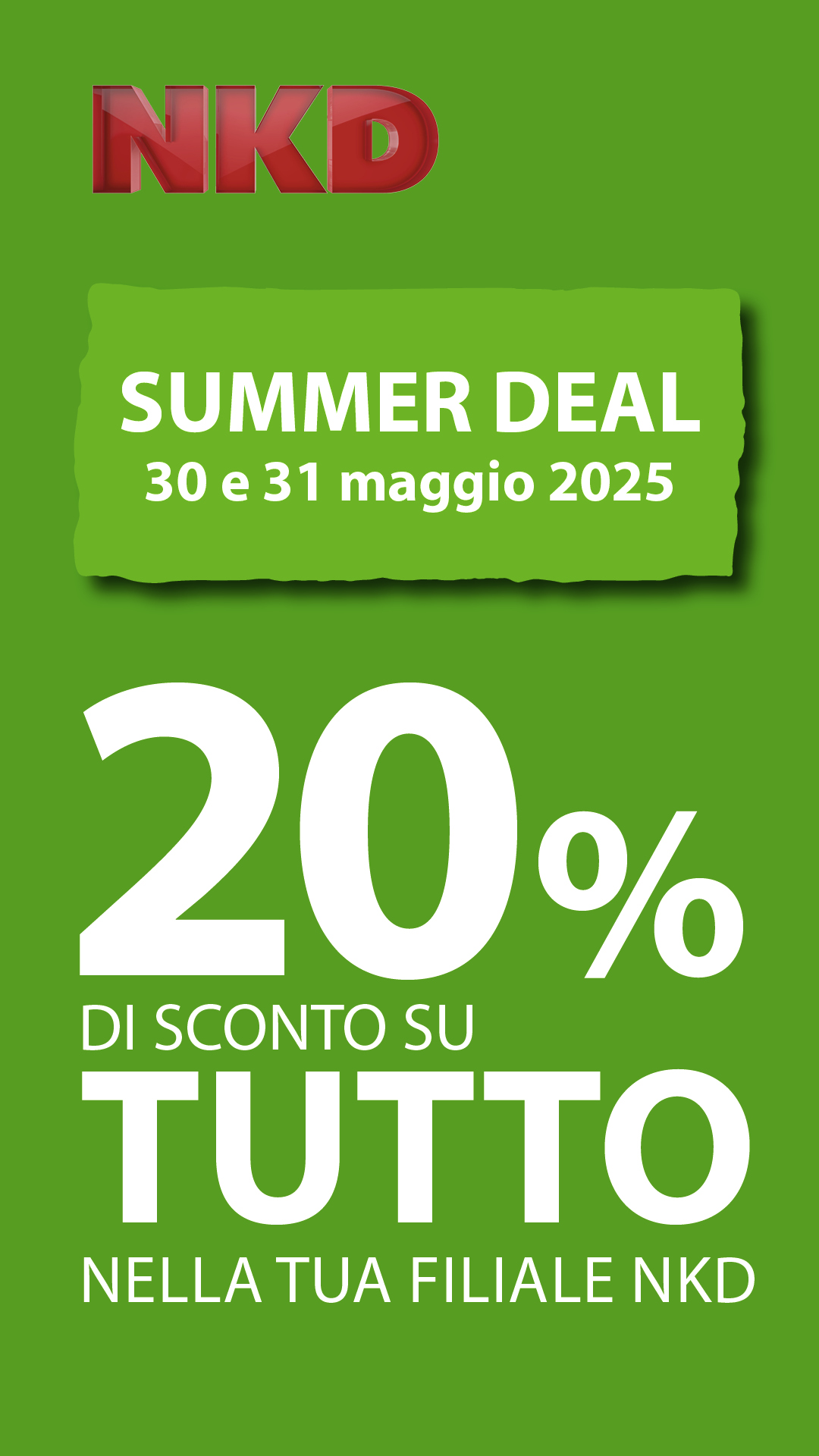 Approfitta del 20% di sconto su tutto, il 30 e 31 maggio corri nella tua filiale NKD!
