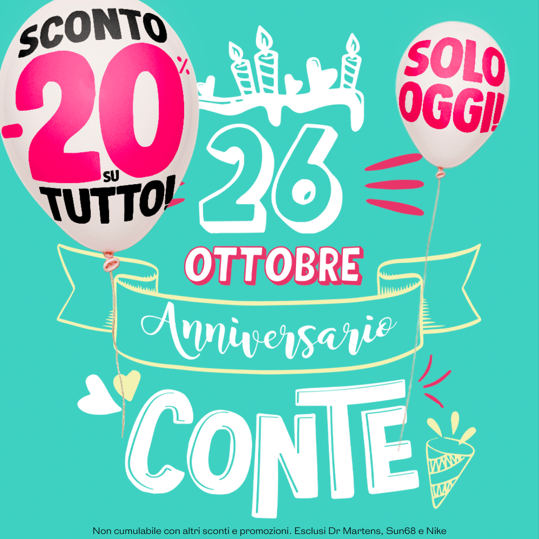 In occasione del 46° compleanno Conte’, SOLO OGGI 26 Ottobre, SCONTO DEL 20% SU TUTTO*!